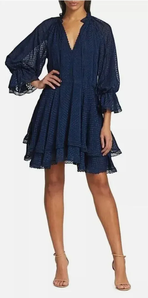 Alice + Olivia Joanne Lace Trim Ruffle Tiered 3/4 Sleeve Mini Dress Blue Exquisitely exuberant, th... Show more
