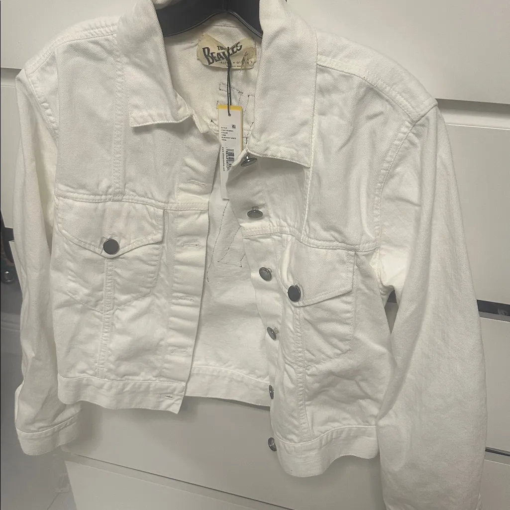 Alice & Olivia brand new with tags white denim jacket featuring a bold 'The Beatles' patch on the ba... Show more