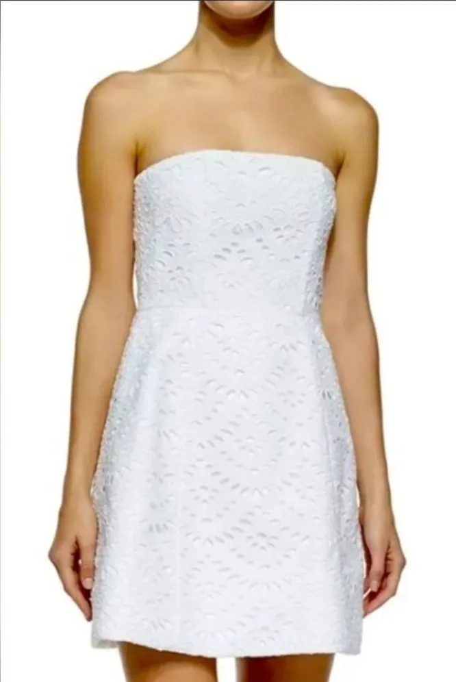 Chic strapless design. Intricate lace pattern. Perfect for elegant events.