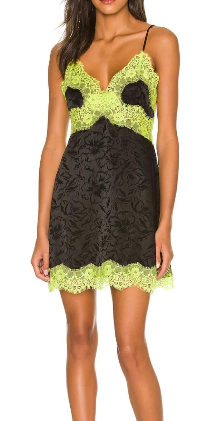 ALICE + OLIVIA Zaira Lace Trim Mini Dress Black/Lime Punch Sz 2 Black floral print jacquard dress, l... Show more