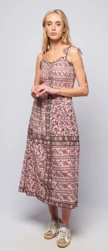Alix of Bohemia Luna Bandana Midi Dress Sz. L Retail $580 NEW WITH TAGS! Measurements Taken: 52",17"arm pit to arm pit (has elastic), 15" waist (flat, has elastic) Smocked sweetheart dress rendered in hand printed cotton, with tie shoulder straps, side pockets and zipper. This textile has been printed by hand, using traditional methods. Subtle printing and dye variations will occur in this fabric. These are part of the natural beauty and character of the hand printing process, and the signature of the maker's hand. 100% Hand Printed Cotton Side Zipper Wash Cold, Line Dry Side Pockets