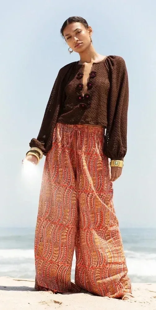 Alix Of Bohemia Women's Natalie Orange Pant, size XL wide leg Inseam 30.5” Waist 15”, but it has elastic in it, so it’s very stretchy New without tags condition Hand block printed wide leg pant with an elasticated drawstring at the waist, finished with cowrie shells and tassels. This textile has been printed by hand, using traditional methods. Subtle printing and dye variations will occur in this fabric. These are part of the natural beauty and character of the hand printing process, and the signature of the maker's hand. Key words: contemporary, romantic, edgy, sophisticated, bohemian, traveling, resort wear, lounge wear