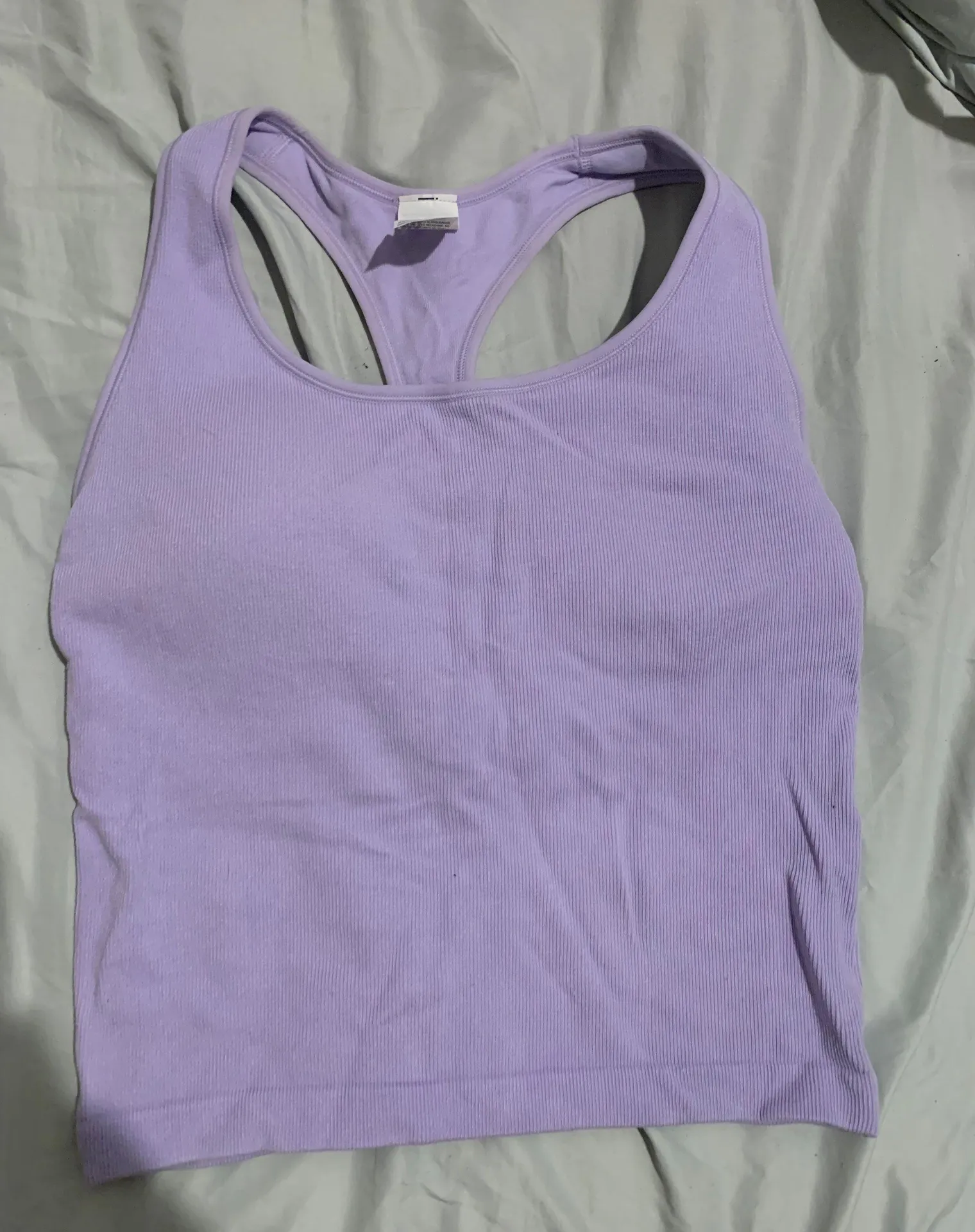 Light purple workout tank top with built in bra lining! Super stretchy material and supportive. Ru... Show more