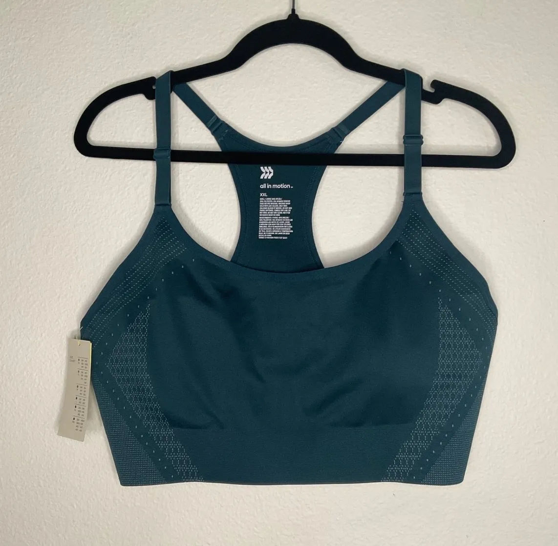 A supportive and stylish All In Motion sports bra designed for your active lifestyle. This seamless bonded rib bra features a racerback design for enhanced support and freedom of movement. The bra is engineered with moisture-wicking fabric to keep you cool and dry during workouts, and a wide underband provides a secure and comfortable fit. The bra also boasts a stylish navy blue hybird color that complements any workout outfit. Perfect for running, yoga, gym sessions, or even as a comfortable everyday bra. Measurements: • Band width: 17 inches Color: Blue Type: Bra Style: Sports Bra Band Size: XXL Support Level: Medium Character: Active, Racer, Bonded, Seamless, Hybird Features: Seamless, Adjustable, Mesh Inserts, Lightweight, Moisture Wicking Performance/Activity: Yoga, Running & Jogging, Cross Training, Athleisure, Gym Department: Women Keywords: All In Motion sports bra, XXL sports bra, seamless sports bra, bonded rib bra, navy blue sports bra, racerback sports bra, activewear, workout bra, gym bra, running bra, yoga bra, plus size sports bra, moisture wicking sports bra
