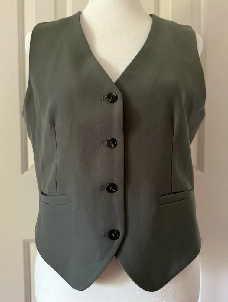 The All Row Women's New Button Up Sleeveless Boyfriend Style V-neck Vest is a versatile and stylish fashion piece made of poly/spandex with a polyester lining. This olive vest features a button closure, making it suitable for various occasions such as travel, parties, casual outings, formal events, work, and business meetings. It is new with tags.