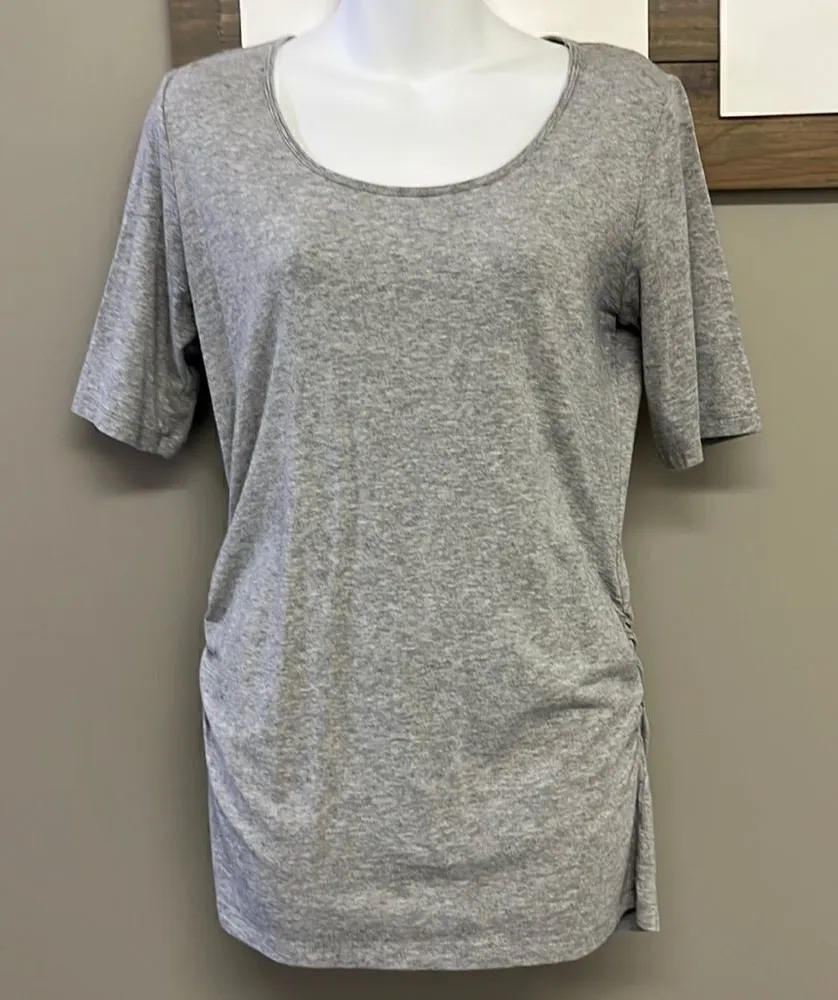 Gently worn, great condition Women’s small Heather gray Soft and light material Scoop neck Short sleeves Rouging on sides Measurements (when flat) Collar to shoulder- approx 8” Shoulder to sleeve- approx 11” Length- approx. 27.5” Armpit to Armpit- approx 17.5” Care- machine wash cold, tumble low Material-57% cotton, 38% modal, 5% spandex