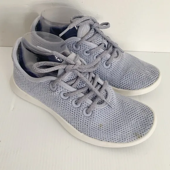 Allbirds Women’s True Runners TR Baby Blue Lace Up Sneakers Size 8 Baby blue color Made from sustainably harvested trees Lace up Round toe Removable cushioned footbed Flexible and lightweight Rubber outsole Good used condition a few stains on both shoes see photos Smoke free home