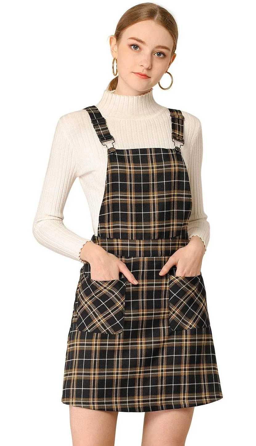 NWT Allegra K plaid overall pinafore dress in a vintage checkered print. Features adjustable suspender straps, two front pockets, concealed zipper back, and an A-line above-knee silhouette. Perfect layered with sweaters or tops for fall, winter, or holiday looks. Color: Black/Brown Plaid Style: Suspender Pinafore / Jumper Dress Material: Blend (Machine washable) Fit: High waist, A-line Length: Above the knee Closure: Pull-on with zipper back Details: Adjustable straps, front pockets Condition: New with tags Size: XL Great for school, weekend outings, Christmas events, or a dark academia style. Bundle to save. Fast shipper.