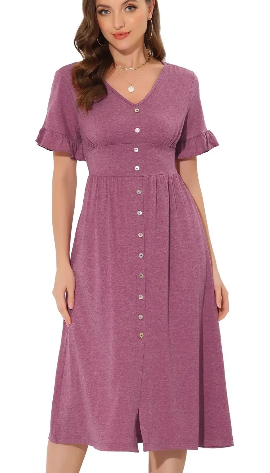 A fushsia midi dress with a V-neckline and decorative button front. This dress features short sleeves with a charming ruffle detail and a defined, smocked waistband that flows into a relaxed A-line skirt. Style: Sundress, A-Line, Fit & Flare Dress Length: Midi Sleeve Length: Short Sleeve Pattern: Solid Material: Polyester, Rayon Neckline: V-Neck Measurements laying flat: Pit to Pit: 20" Shoulders: 17 1/2" Waist (not stretched): 16" Length from shoulders: 49" Keywords: midi dress, ruffle sleeves, button front, V neck, pink dress, smocked waist, casual dress, day dress, feminine, comfortable, summer dress, spring dress Orders ship next business day. Smoke free home.