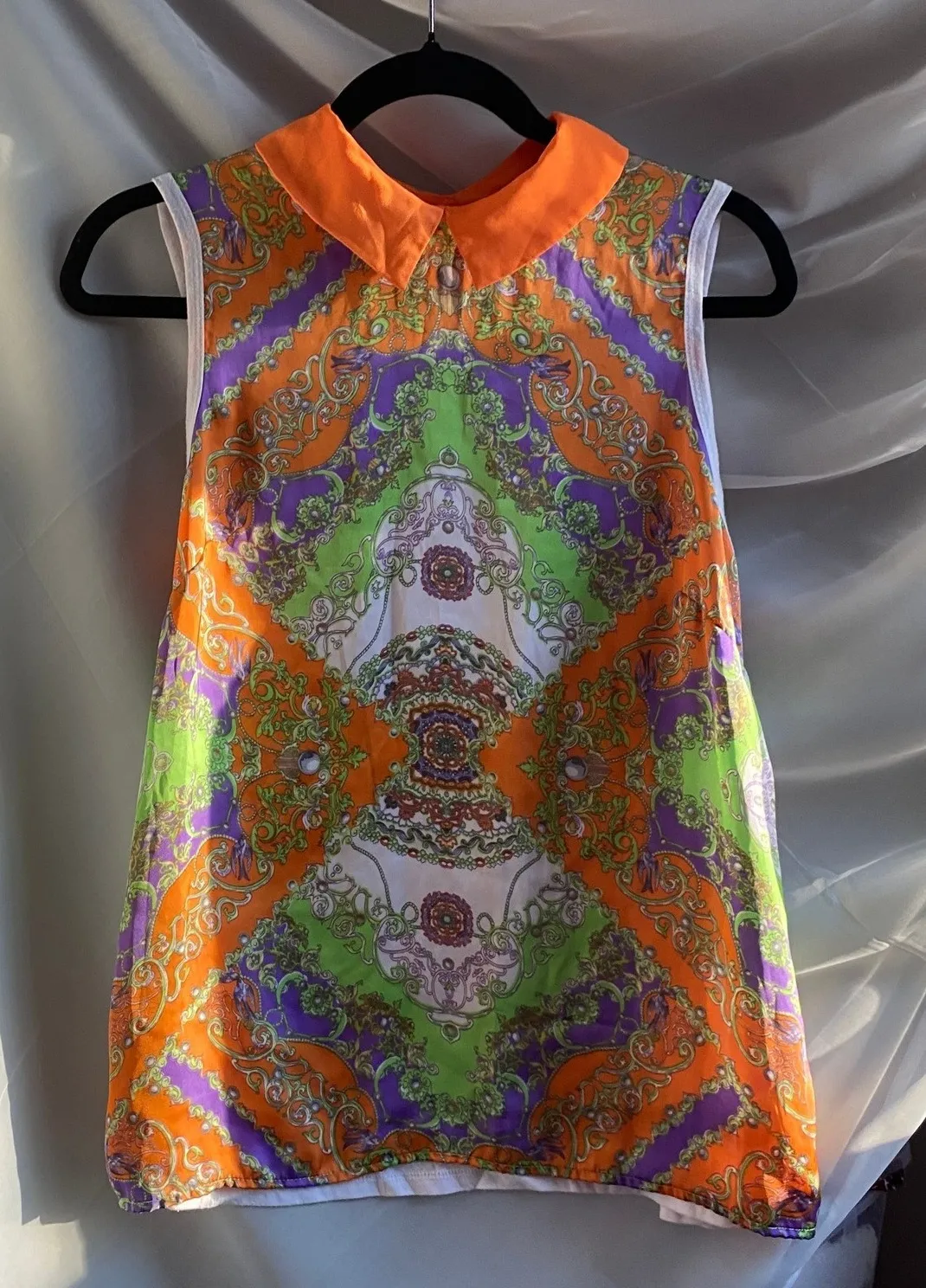 Allen B by Allen Schwartz Y2K collared sleeveless blouse in a vibrant geometric print. This eye-catching blouse features a classic pointed collar and a sleeveless design perfect for warmer weather. The bold pattern combines shades of orange purple and green. In great condition, small discoloration in the back as seen in last pic. Approximate measurements: 23" ptp, 26" length Type: Blouse Department: Women Style: Tunic Neckline: Collared Sleeve Length: Sleeveless Sleeve Type: Classic/Fitted Sleeve Pattern: Paisley Accents: Button Theme: Colorful, 60s Features: Collarless Fit: Regular Fabric Type: Woven Occasion: Casual, Party/Cocktail Closure: Pullover Season: Summer, Spring hippy, bohemian, cherry girl, fest, y2k, sleeveless blouse, collared shirt, geometric pattern, statement top, vibrant print, summer fashion, workwear, casual chic, bold colors, designer top, aline silhouette, mod style, retro vibe