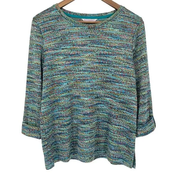 ALLISON DALEY Colorful Knit Sweater Top Color: Multicolor with a Teal Main Color Size: Medium Fabric: Polyester, Spandex Condition: Excellent, Pre-Owned Condition! Crew Neckline 3/4 Sleeve with Button Detail Relaxed Fit Side Slits at Hem Measurements Taken Lying Flat and are Approximate: Pit to Pit: 20.5" Length Shoulder to Hem: 24.5" Sleeve Length: 18" Tags: casual knit colorful multicolor spring fall winter business casual office work preppy modern contemporary conservative