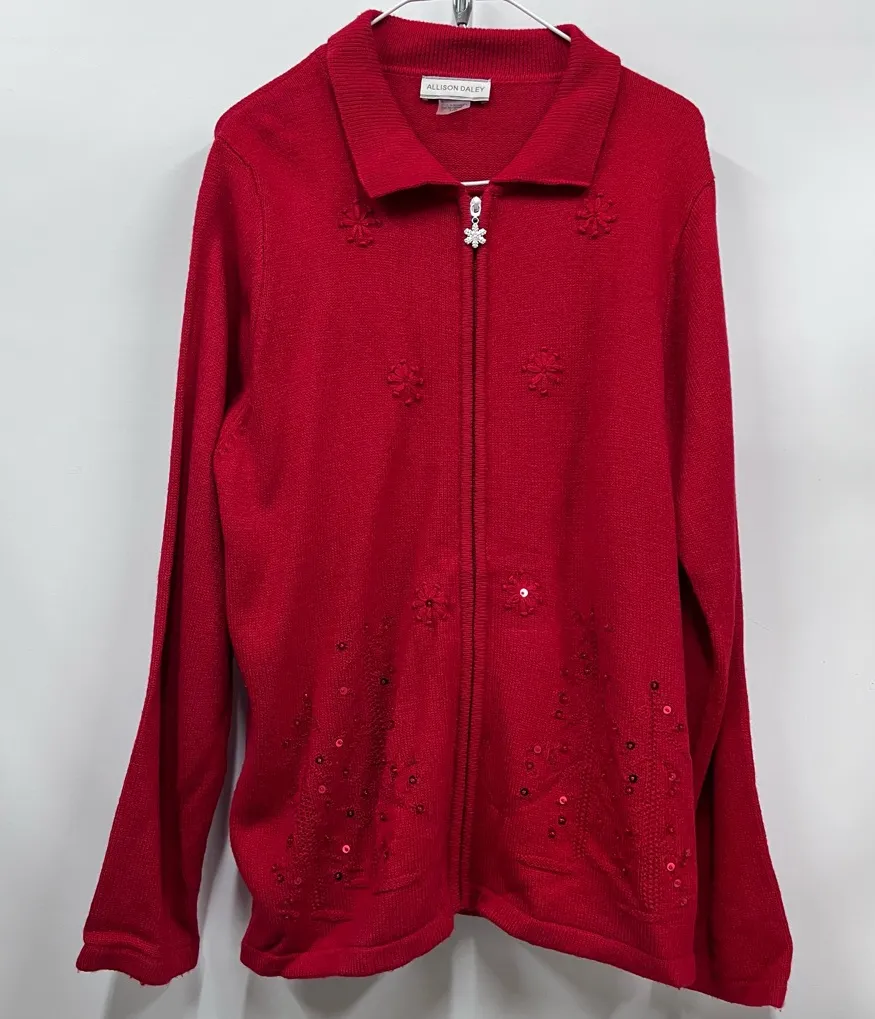 Allison Daley Red L full zip up long sleeve sweater snowflake appliqué sequins Size L - $31 - From Maricella