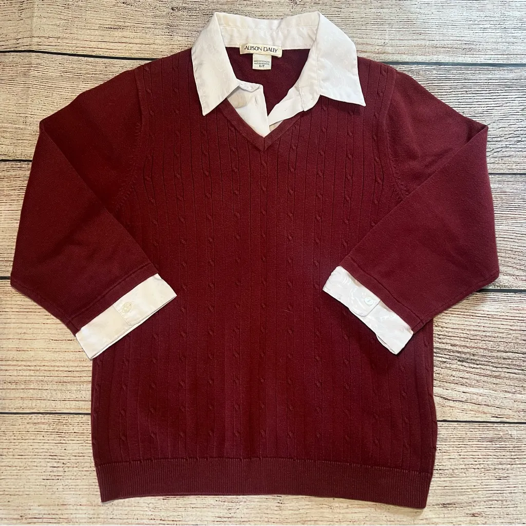 Excellent condition. Built in white collar. Beautiful detailing on the collar & wrist cuffs. Brand: Allison Daley. Womens size small. Total length: 22.5” Underarm to underarm: 16.5” Shipping same day or next business day ALWAYS. Smoke free home. If you have any questions at all, do not hesitate to ask! *SKU 66* Vintage 90s Collegiate Academia practical Magic Vibes Witchy preppy Christmas Party Holiday Classic fall knit