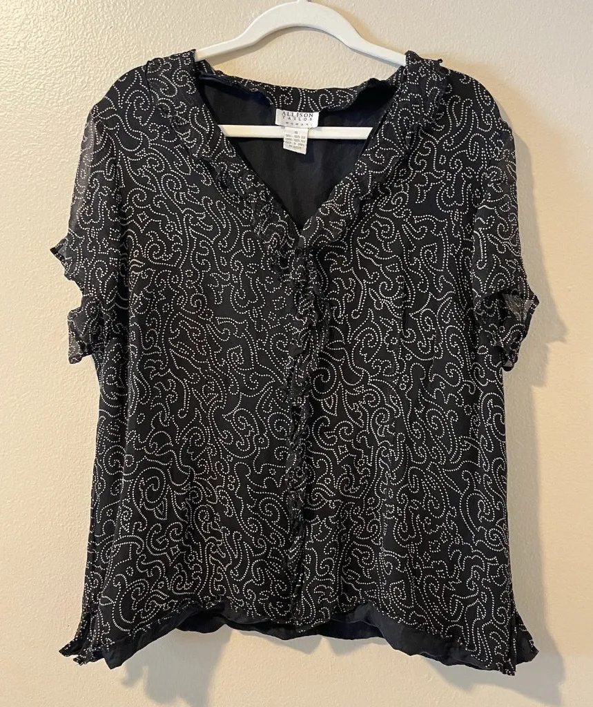 In good used condition, the silk lining is peaking out on hem (see photo) a few tiny runs in fabric (not very noticeable Women’s size 1X Vintage 100% silk Ruffle detail Delicate polka dot pattern Whimsical Whimsigoth feminine cottage fairy grunge y2k twee witchy 90s 08