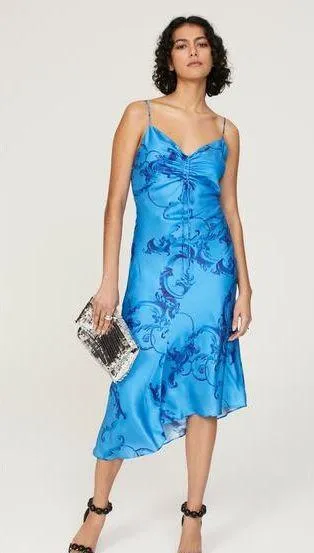 Overall good preowned condition. Moderate wear and light snags. Size: 4 Approximate measurements with garment laying flat: 17” bust, 16” waist, 52” length Color: Blue Tie dye printed satin (65% Viscose, 35% Silk) Slip Sleeveless Asymmetric hem, midi length V-neck Side zipper closure A ruched tie front gives a flowy shape to this asymmetrical satin slip dress by AllSaints. OFFERS WELCOME BUNDLE & SAVE MORE SAME OR NEXT DAY SHIPPING ITEMS PACKAGED WITH CARE