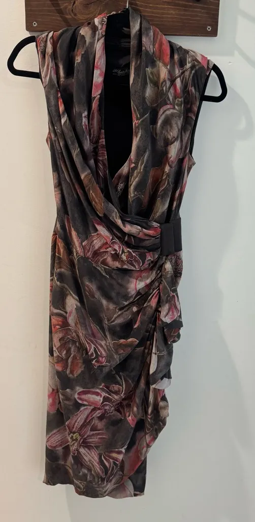 UK 10/US 6 100% Silk True Wrap with Hook & Eye Close Sleeveless Cowl Neck Midi Length Excellent Preloved Condition Tags: natural, breathable, cocktail, party, classy, elegant, chic, travel