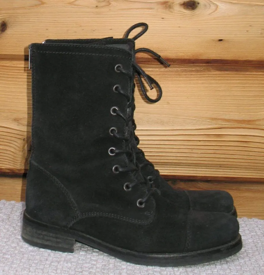 *There is a small nick on one of the soles. Light wear to the soles. Details: All Saints Size: 38 (7.5) Color: Black Back zip closure Lace-up front Oil rubbed suede Shaft: Approx. 9" Heel Height: Approximately 1.25"
