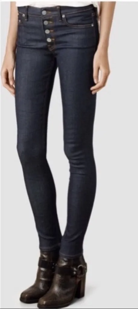 EUC- no wear to note/ like new. 93% Cotton, 5% Poly, 2% Elastane mid-weight quality stretch denim fabric. 5 functional pockets. Button fly. Most popular design, AllSaints Mast Jean is reworked w/an exposed shank button fly. Cut from raw indigo denim for a vtg feel, the Button Mast/Raw will define your everyday look. Wear w/biker boots and simple tees. Measurements taken flat: Waist: 14.25" Front Rise: 8.75" Inseam: 30" Leg Opening: 5.5"