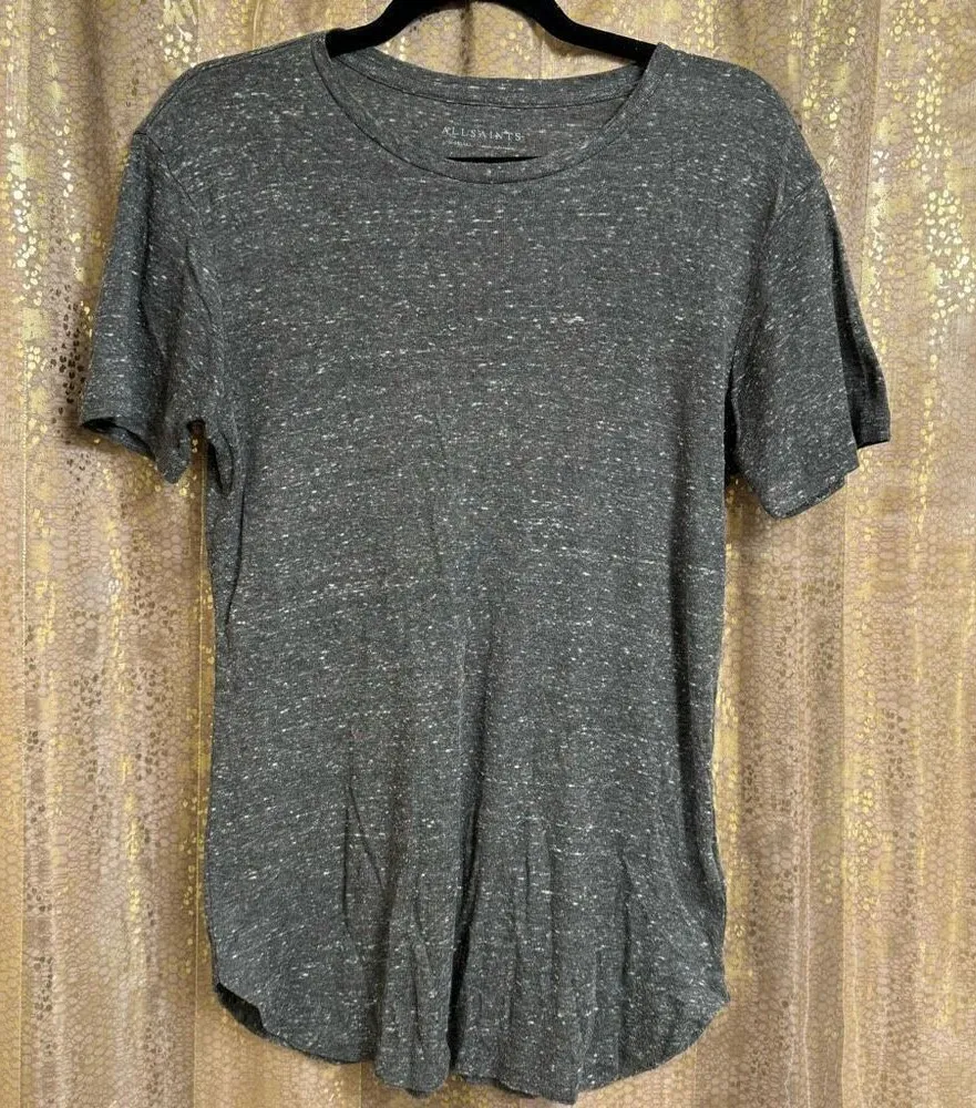 All Saints Heather Gray Hathan Short Sleeve Crew Neck T Shirt XS Good gently used condition, lots of stretch. No major flaws or signs of wear. Smoke and pet free home. Rounded split hem, kinda like a tunic but not as long. Darker Heather Gray color. Size XS, true to size. A great basic piece for wearing alone or layering. Polyester, Viscose and cotton materials.