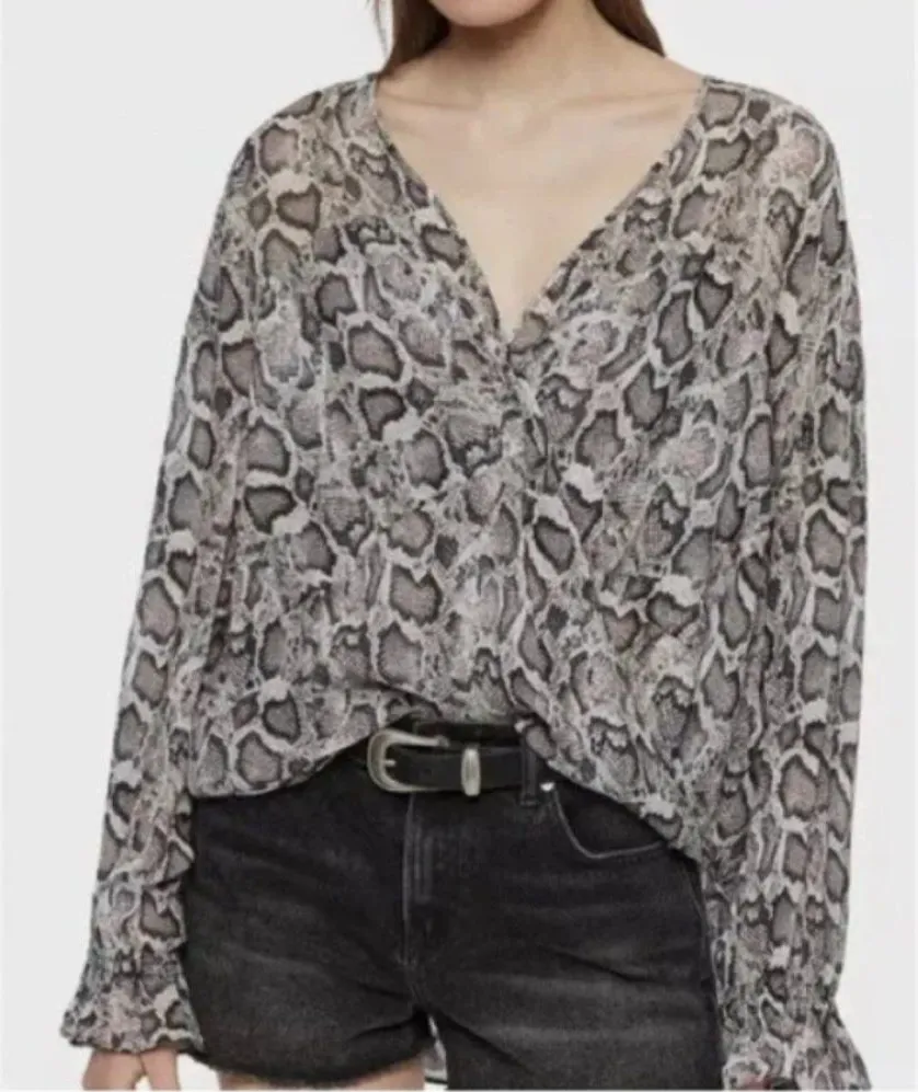 Excellent Condition Size: Large Color: Black and White Snakeskin Print 70s silhouette, modern print. The Penny Top features our new Misra snake print alongside a deep v-neckline and elasticated cuffs - offering a vintage aesthetic. 100% viscose