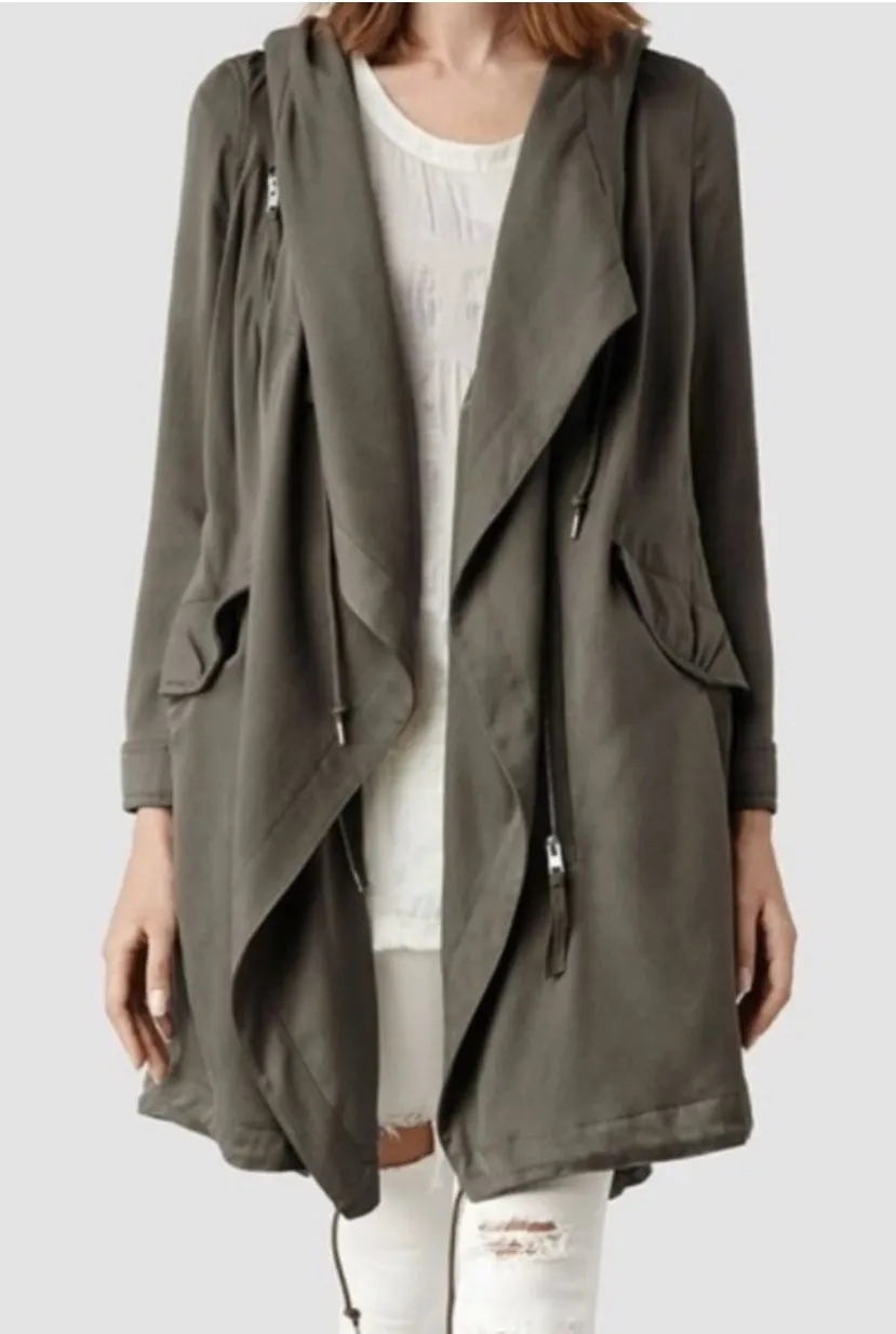 All Saints "Portere" parka, size 4 Draped style that can be worn open or closed. 2 very small bleach spots on the back of one shoulder, as well as a very faint spot of fading at the bottom hem as shown in pictures. Good preowned condition otherwise. Lyocell outer. Polyester lining Total length: 37” Chest armpit to armpit: 19.5”