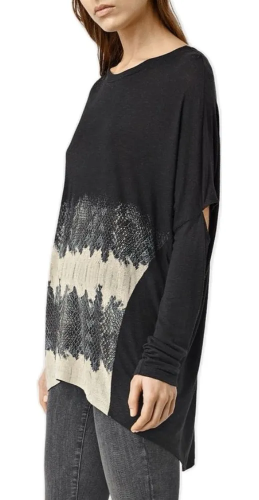 Very thin knit makes it comfortable for any season. Elbow cutouts for edge. Snake print in black and cream on front in high low styling. 70% viscose 30% linen Preowned no flaws. Flatlay Measurements (approximate) Chest 24 inches (hard to measure because of curve of hem) Length front 25.5 inches Length back 29.5 inches Sleeve from pit 13 inches Waist 21 inches