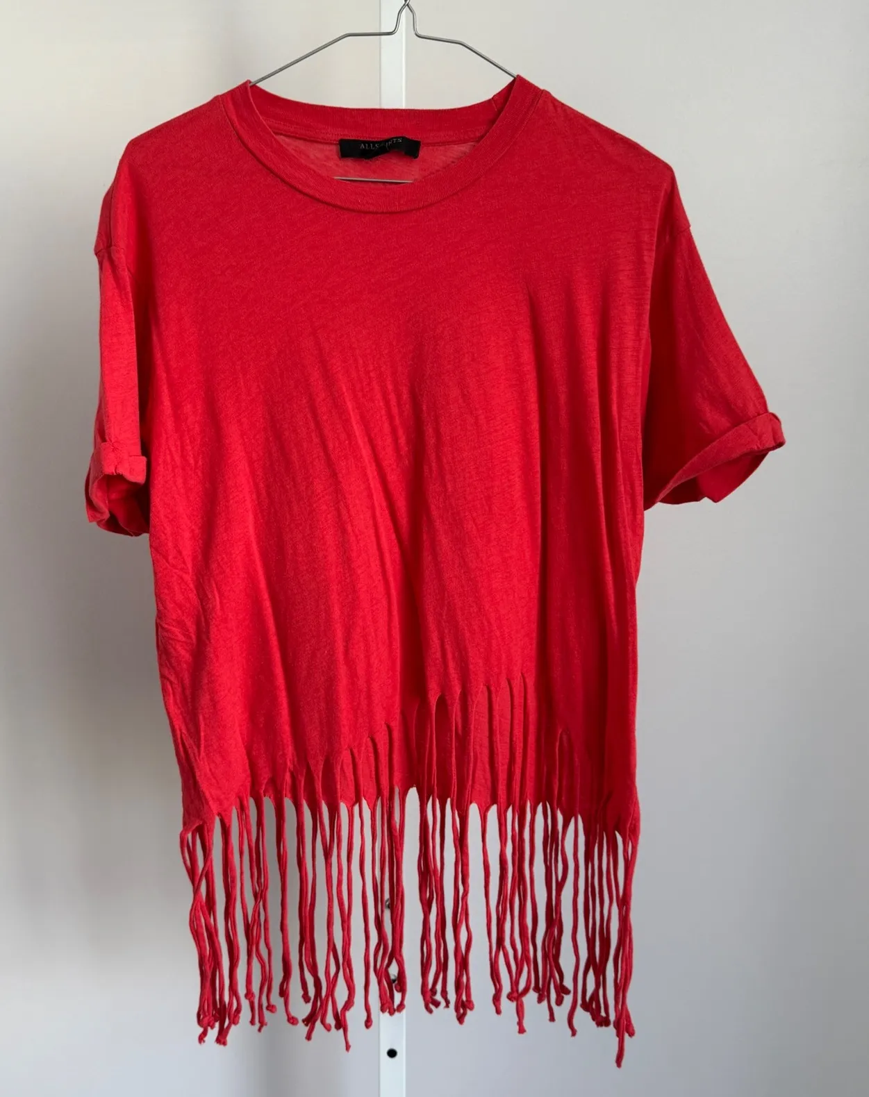 AllSaints Fringe T-Shirt Women's sz S Red Lagenlook boho hippie Short Sleeve Top Keywords: AllSaint... Show more