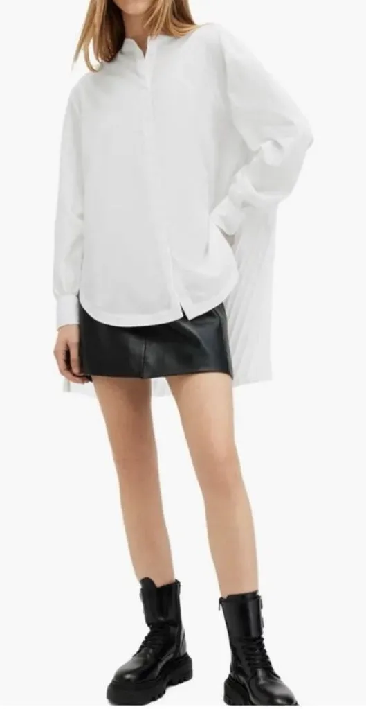 When it comes to curating a staple wardrobe, shirts are a must. The Percy is top of our list. This relaxed fitting style is new this season. It's been constructed using recycled fabrics and features a pleated back panel that sits lower for a dramatic addition to this essential piece. Complete with a stand collar and classic cuffs - keep it on rotation all season long. • This shirt is designed to a relaxed fit • Button closure • Collar • Long sleeve • Pleated back panel • Longer back bodice • Cuffs • Recycled fabrics • Lightweight 95% recycled polyester, 5% cotton • Machine wash inside out • This product contains recycled materials. Recycled materials can come from a variety of sources including deadstock fabric, production waste, recycled plastic bottles and even fishing net waste recovered from oceans. Size 2 Measures 21” pit to pit. Measures 27.5” in length (front of shirt), back of shirt measures 34” New without tags Retail $229