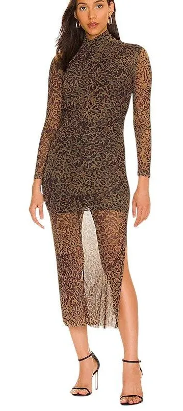 ALLSAINTS Tia Halftone Long Sleeve Dress Size: 6 Color: Khaki Green Retail: $199 95% poly, 5% elastane. Partially lined. Hidden back zipper closure. Crisscross mock neckline. Ruched sides. Mesh fabric with side seam slit. Length: 45" Pet-free, smoke-free home. NEW WITHOUT TAGS - NEVER WORN Tiny hole beside zipper on back (see last photo) Ships quickly!