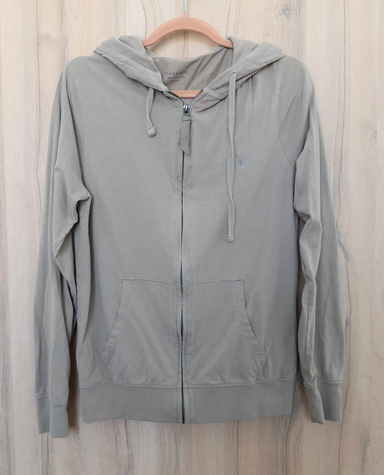 ALLSAINTS women's beige zip-up hoodie in a regular fit. This comfortable and versatile hoodie features a full zip closure, attached hood with drawstrings, and a front kangaroo pocket. The signature ALLSAINTS subtle embroidered logo on the chest adds a touch of brand detail. Perfect for everyday wear, layering for cooler weather, or for a relaxed weekend outing. *Check last photo for approx. measurements, taken flat lay* Style: minimalist, luxe casual, streetwear, quiet luxury, everyday basics, soft neutral, layering piece, modern chic, elevated essentials, athleisure Condition: Excellent condition. No visible flaws. See all photos for details. Ships next business day. Bundle deals available. Smoke-free home. Please check measurements before purchasing.