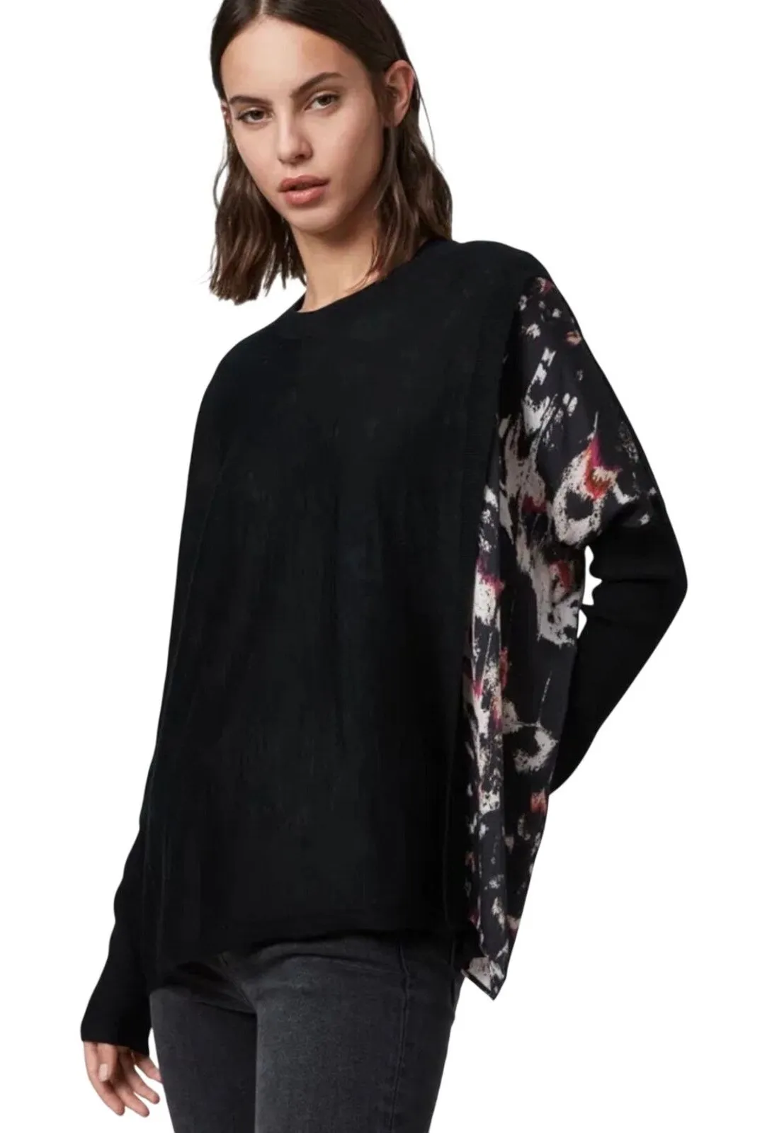 ALLSAINTS Women’s Koko Wing Wrap Black Merino Wool Mixed Media Sweater The Koko Wrap Jumper is cut from pure merino wool to a square silhouette, with a loose front panel, that overlaps the main body. A woven panel featuring our new butterfly print complements the base – the AllSaints twist. Woven: 100% polyester Size small Approximate measurements Retail 178
