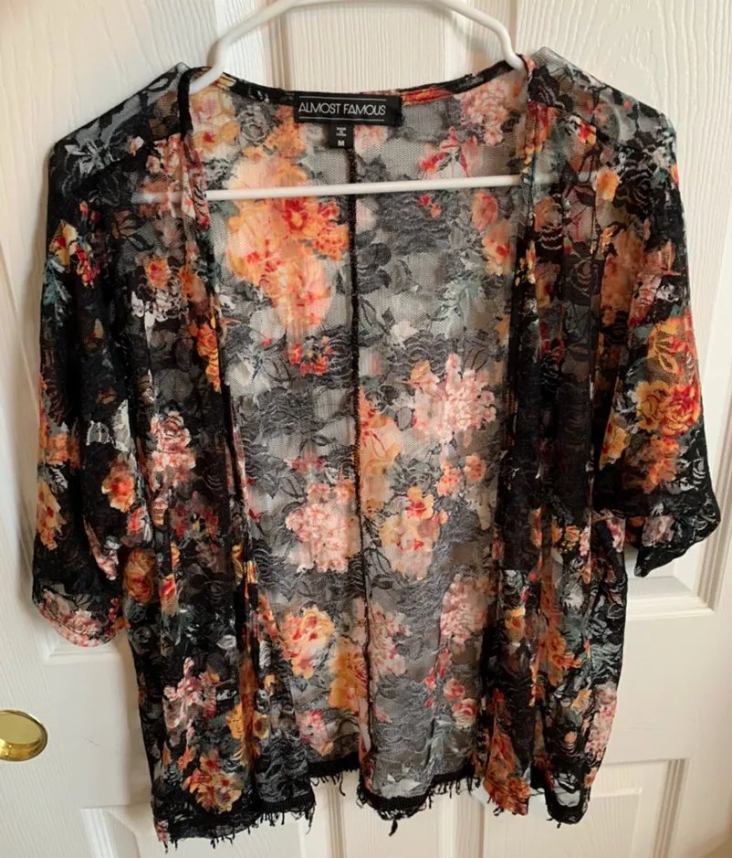 Lace see through floral cover up. Worn a few times good condition! The bottom strings are a little f... Show more