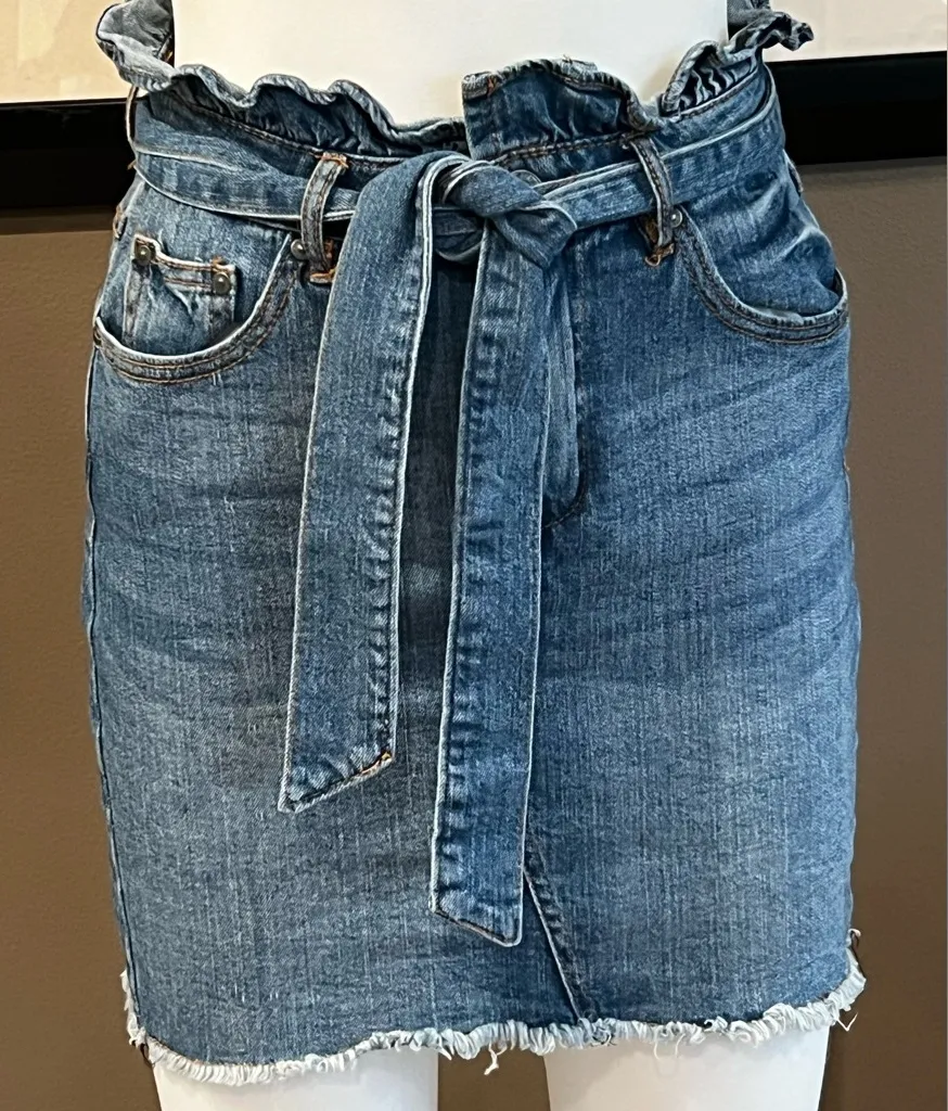 Great denim / jean skirt by Almost Famous. "Paperbag" style mini that ties at waist and has button &... Show more