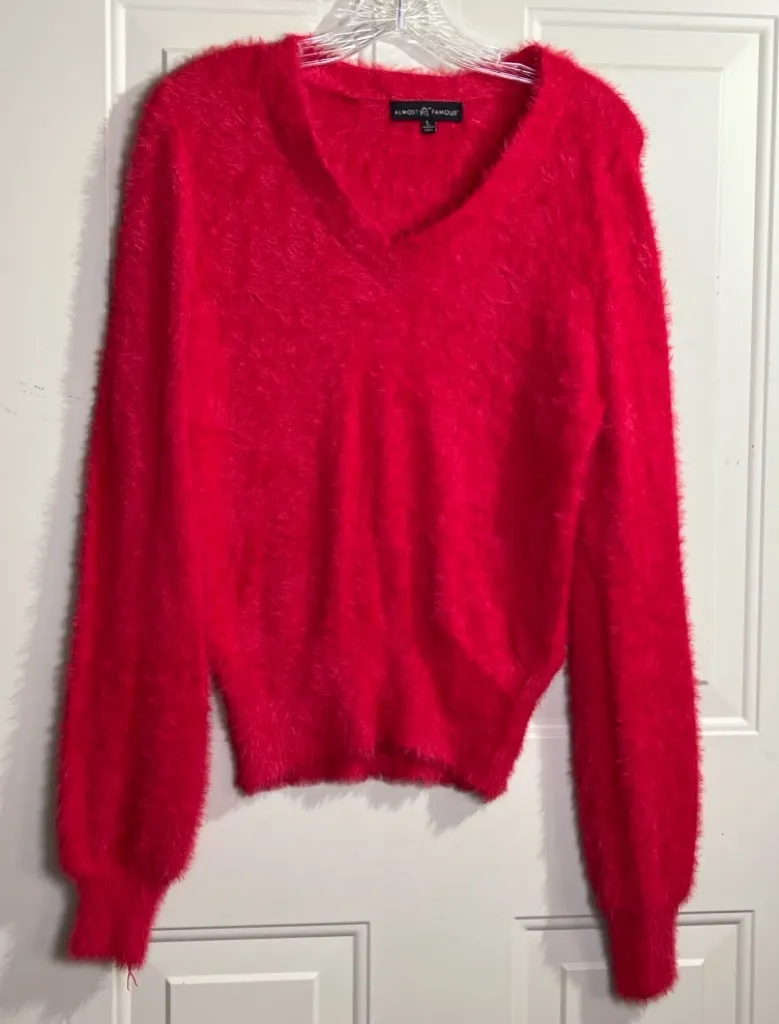 oft and cozy red fuzzy sweater by Almost Famous. Features a flattering V-neckline, long sleeves, and... Show more