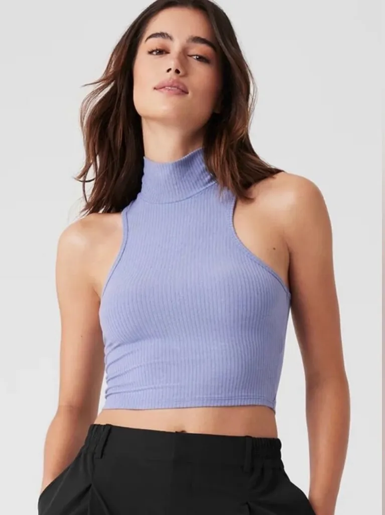 Stylish purple crop top with a ribbed texture. Sleeveless design for a modern look. Ideal for casual... Show more