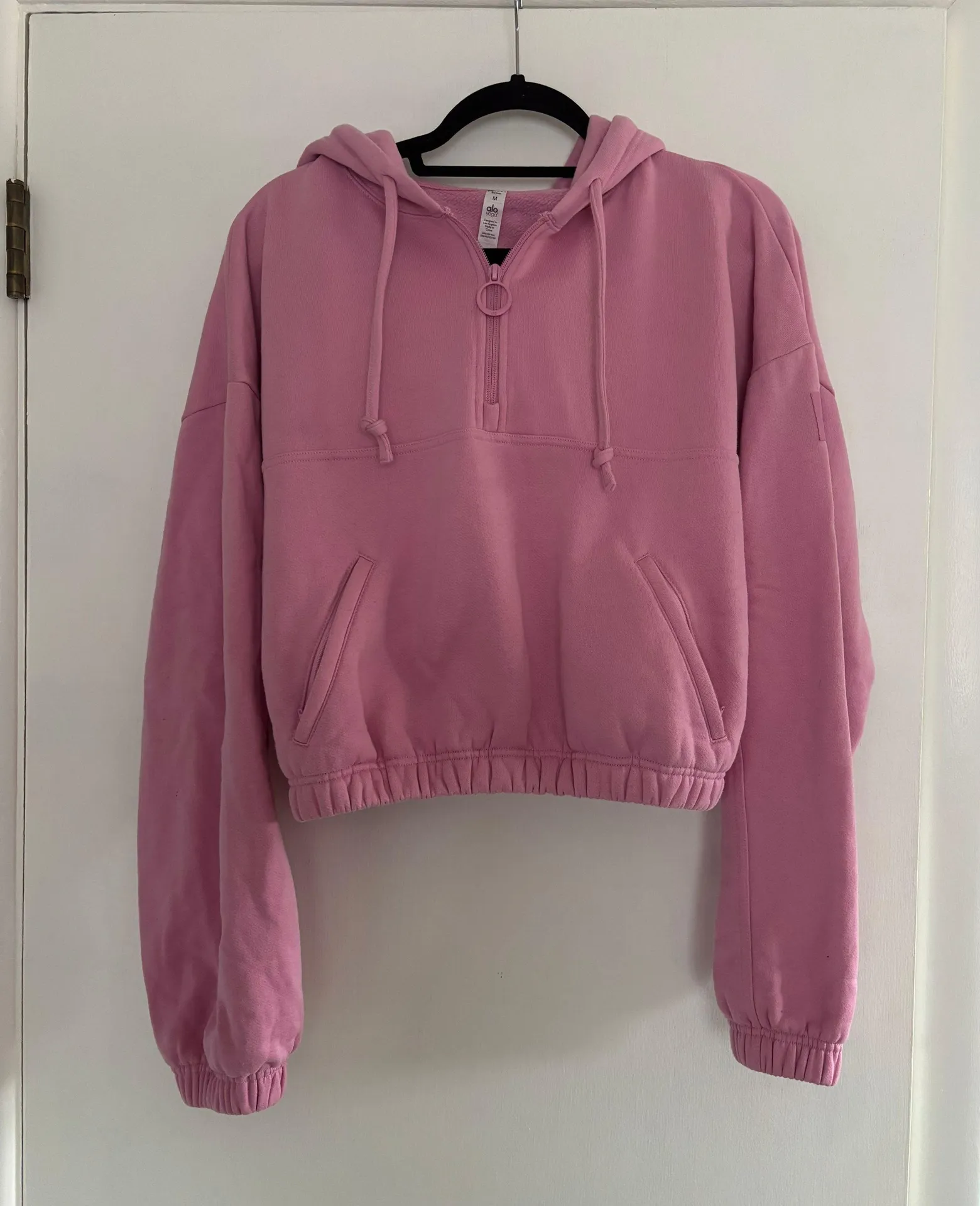 Cropped hoodie with cinched waist. Functional pocket in front. 1/4 zip in the front as well. Cozy ho... Show more
