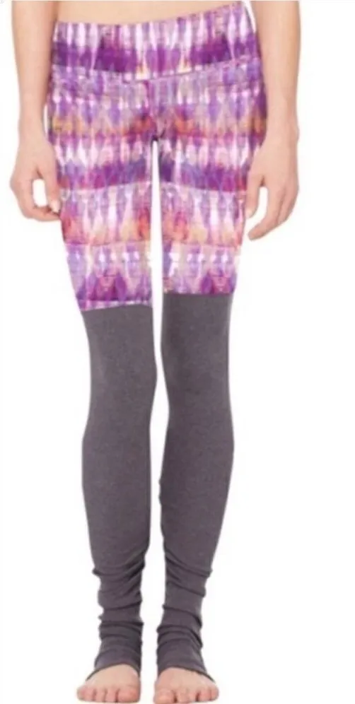 EUC Alo Yoga Goddess Leggings - watercolor Bhakti printed upper and ribbed grey bottoms. Goddess leg... Show more