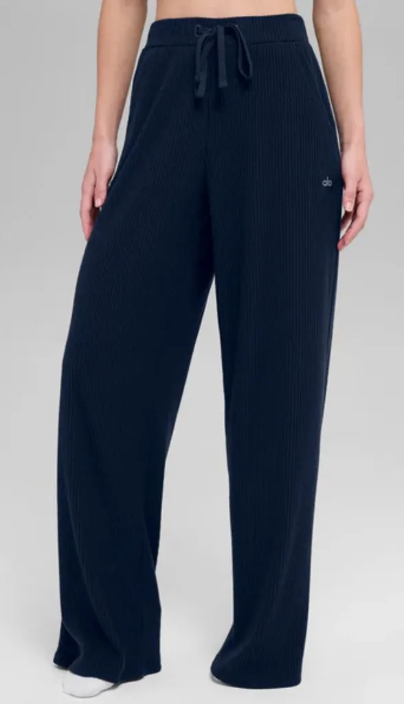 Alo Yoga NWT Muse Wide Leg Ribbed Pants Navy Blue Relax Fit Size S Front Pockets Stylish wide leg... Show more