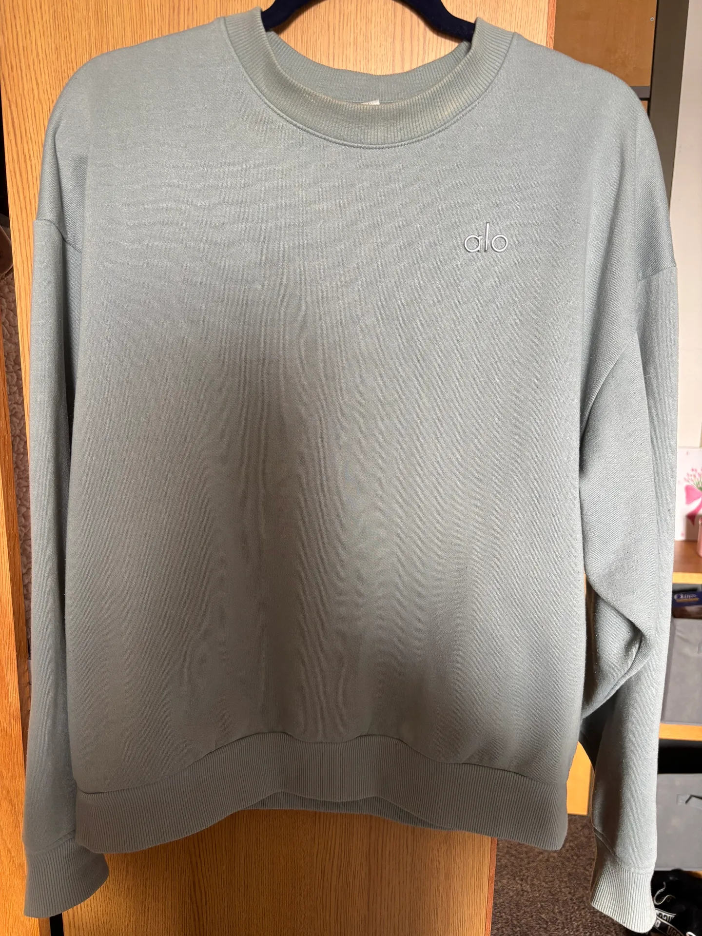 It is lightly used and there are a few signs of wear as pictured! It’s a light green/teal color