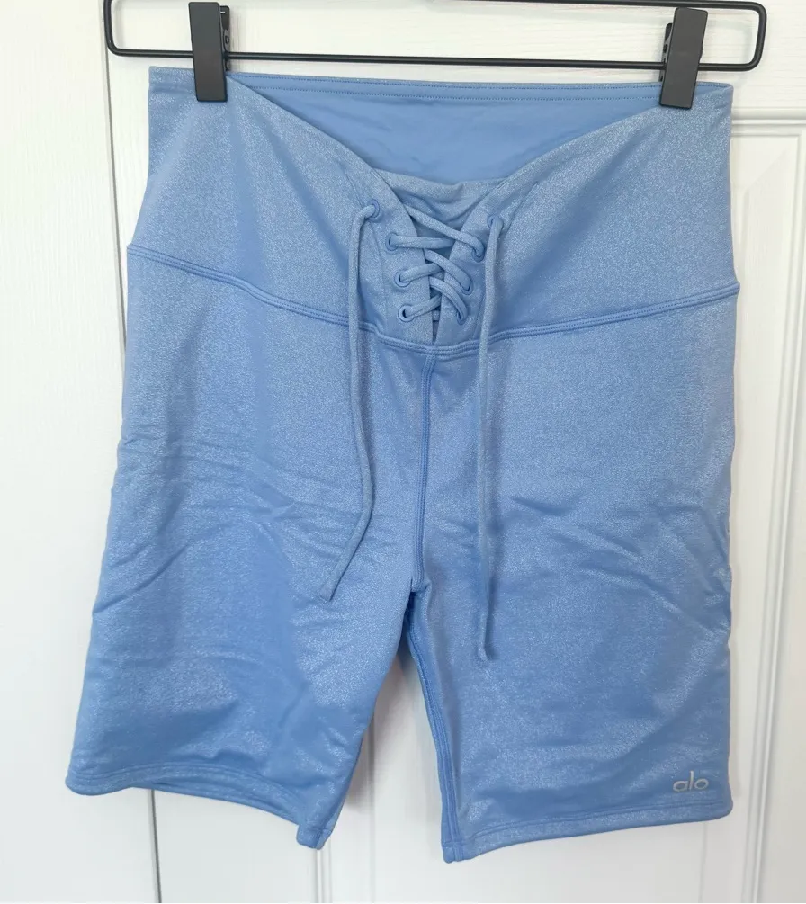 Stylish light blue bike shorts with lace-up front. Perfect for workouts or casual wear. Comfortable... Show more