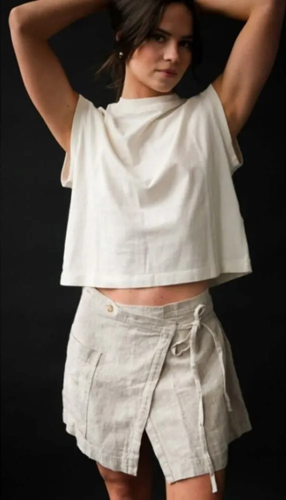 ALOHAS Linen Chari Wrap Skirt in Natural Sz. S Retails $90 Excellent condition! Measures: 15"L,13" waist (flat) Alohas Chari natural mini skirt. The wrap silhouette, fastens with a thin strap on one side, and it can be also be worn with a folded-over waistband. Made from pure linen, it features minimalist details, such as a large patch pocket inspired by utility style. 100% Linen