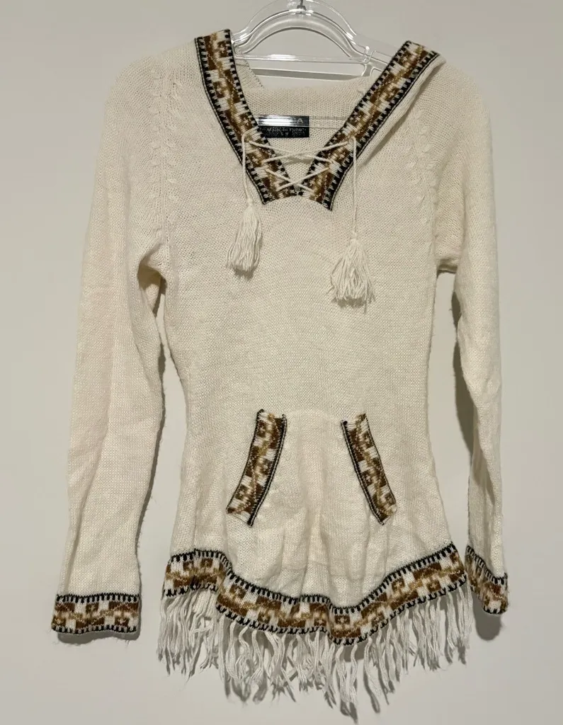 Alpaca Peru Fringe Tassel Knit Sweater with Tribal Accents cream brown size Small/medium. Hood on ba... Show more