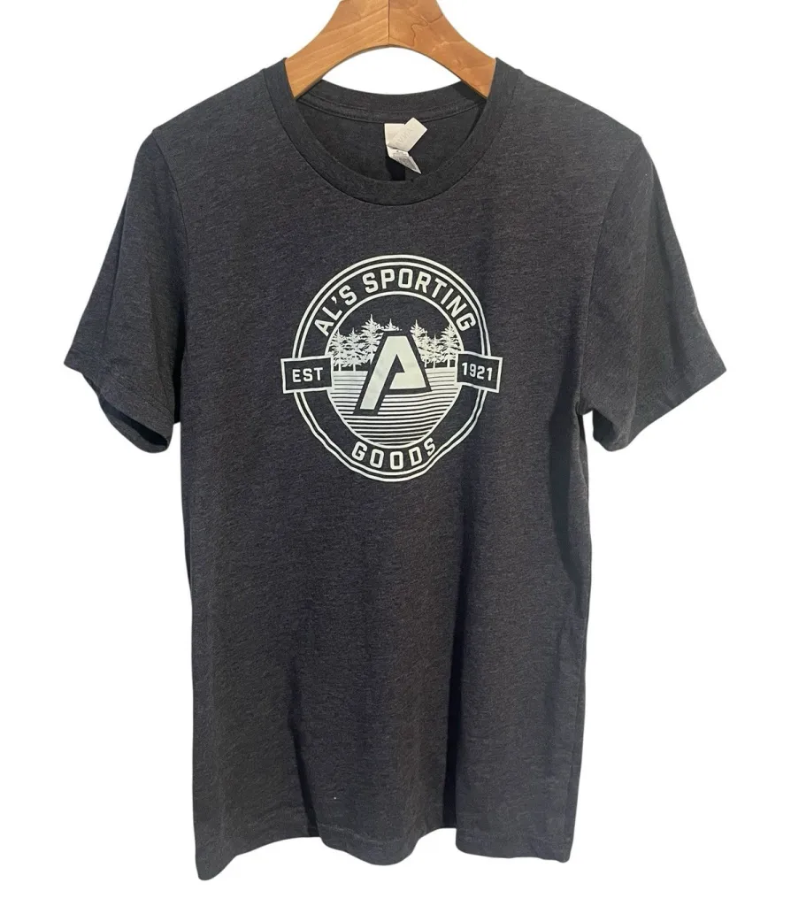 In brand new without tags condition. There are no issues or flaws. Top of shoulder to bottom hem measurement is approximately 28 inches. Armpit to armpit measurement is approximately 17.5 inches. Al's Sporting Goods T-Shirt is a women's size M gray short sleeve shirt featuring a crew neckline and a pullover closure. Made from a blend of polyester and cotton jersey fabric, this lightweight shirt is perfect for casual occasions in the summer, fall, and spring seasons. The shirt showcases a graphic print logo with a theme of outdoor and bicycle, making it a stylish choice for those who enjoy the outdoors and cycling. Easy to care for, it is machine washable and features an athletic fit for added comfort. Item9247