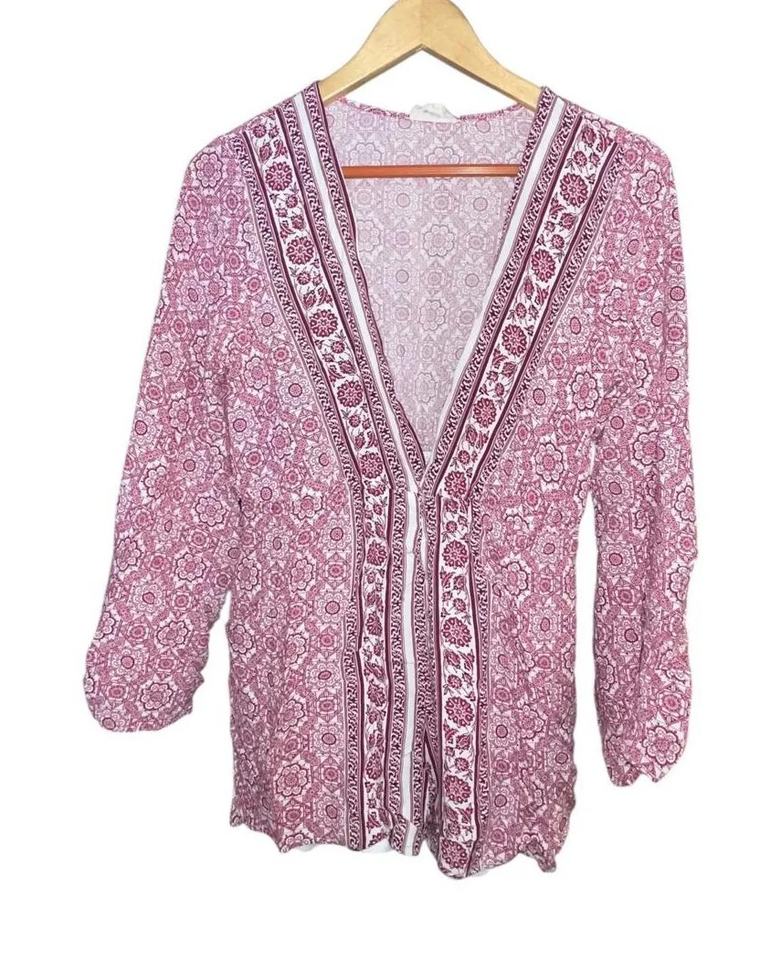 Altar’d State women’s boho-style romper in pink and white floral print, size medium. Features a deep... Show more