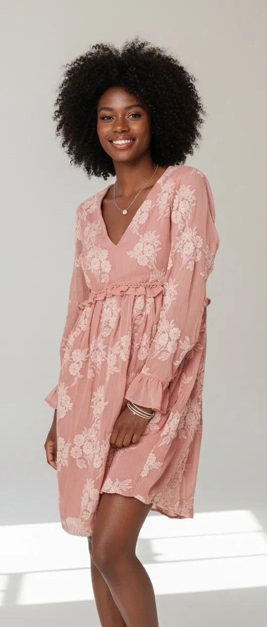 Altard State Dusty rose floral embroidered mini dress with a flattering V-neck and ruffled detailing... Show more