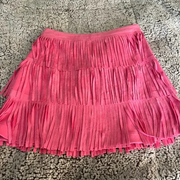Add a playful touch to your wardrobe with this vibrant pink fringe skirt. Perfect for any occasion.... Show more