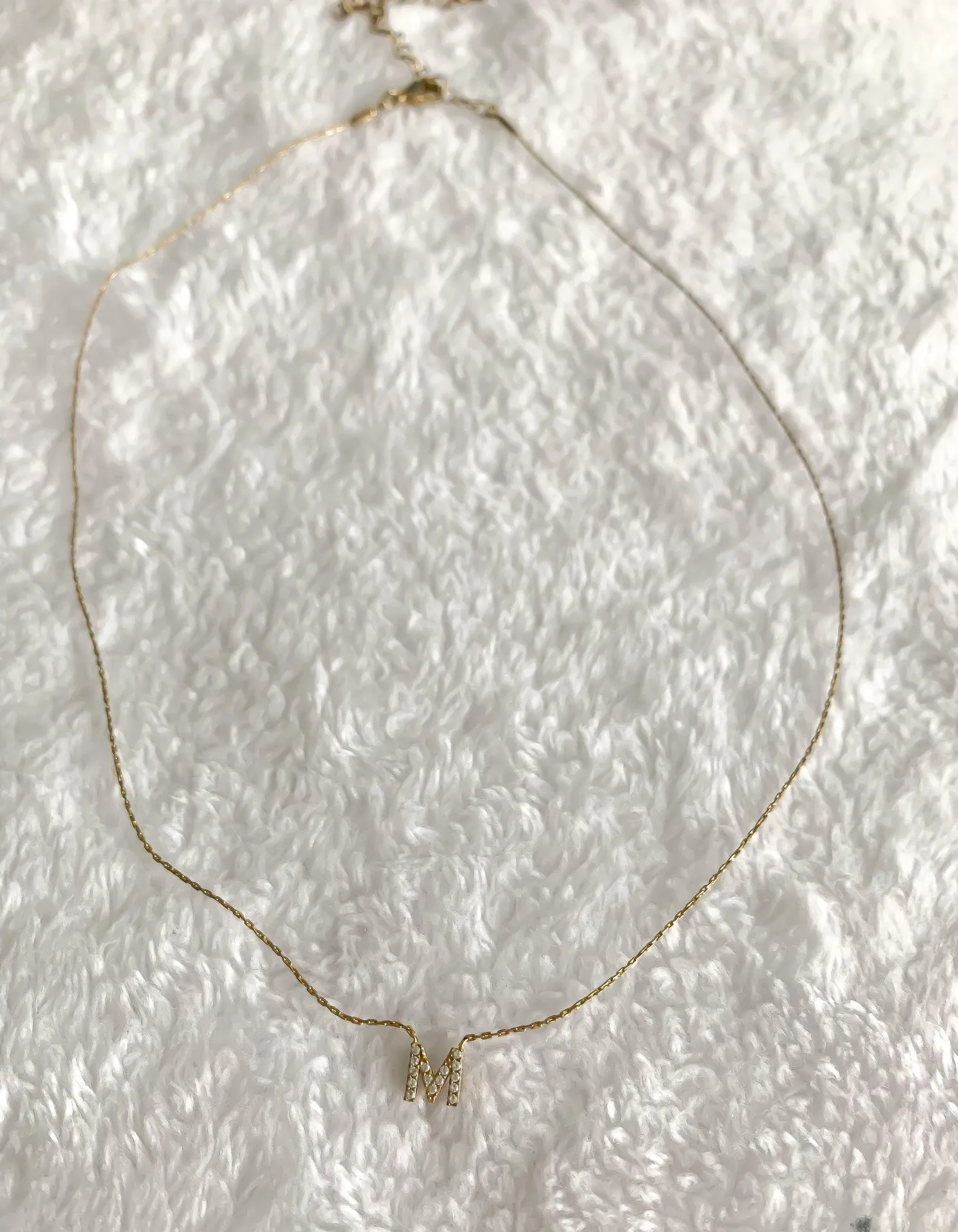 Tiny M necklace, size of a pinky nail No missing rhinestones, just some tarnishing on the clasp as... Show more