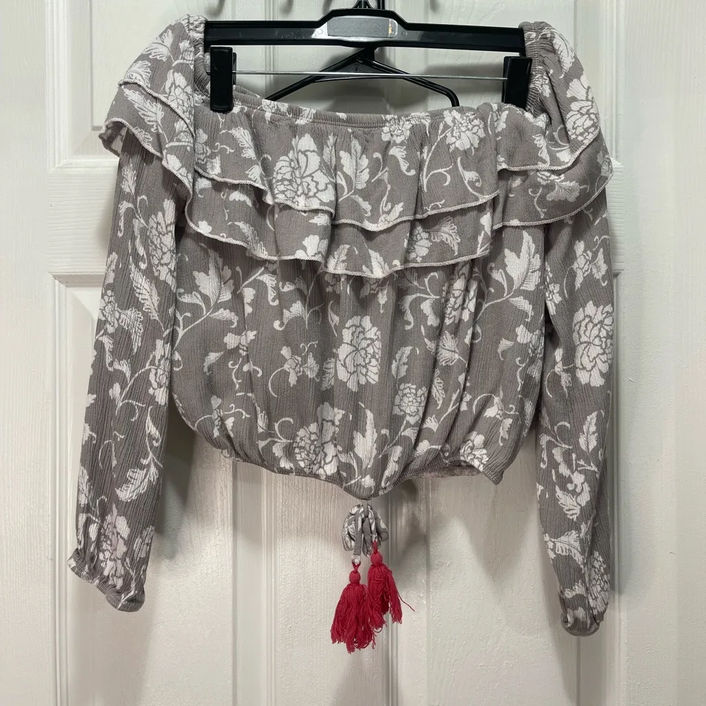 Altar’d State Off the Shoulders Boho Top in a size Large. Grey with floral print. In preowned condit... Show more
