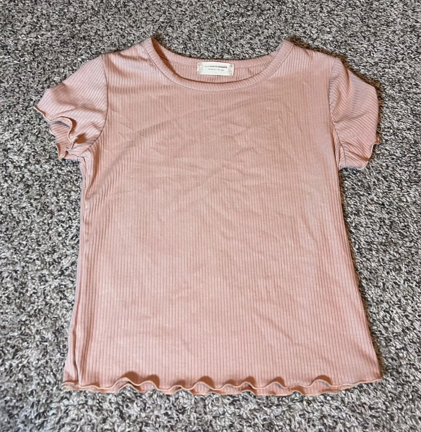 Keywords: Altard State, ribbed t shirt, womens top, pink shirt, short sleeve top, lettuce edge, casual wear, medium size, knit top, crew neck, flutter sleeve, stylish top, comfortable shirt