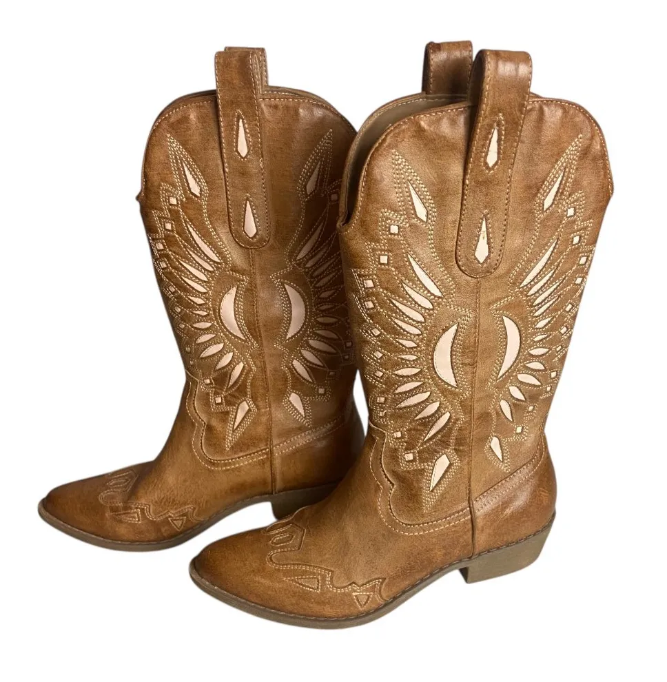 In Great Condition Women's Size 7 Cut out detail Low heel tan, brown color mid- calf height pull on... Show more